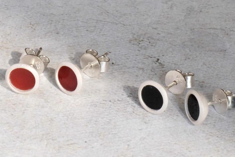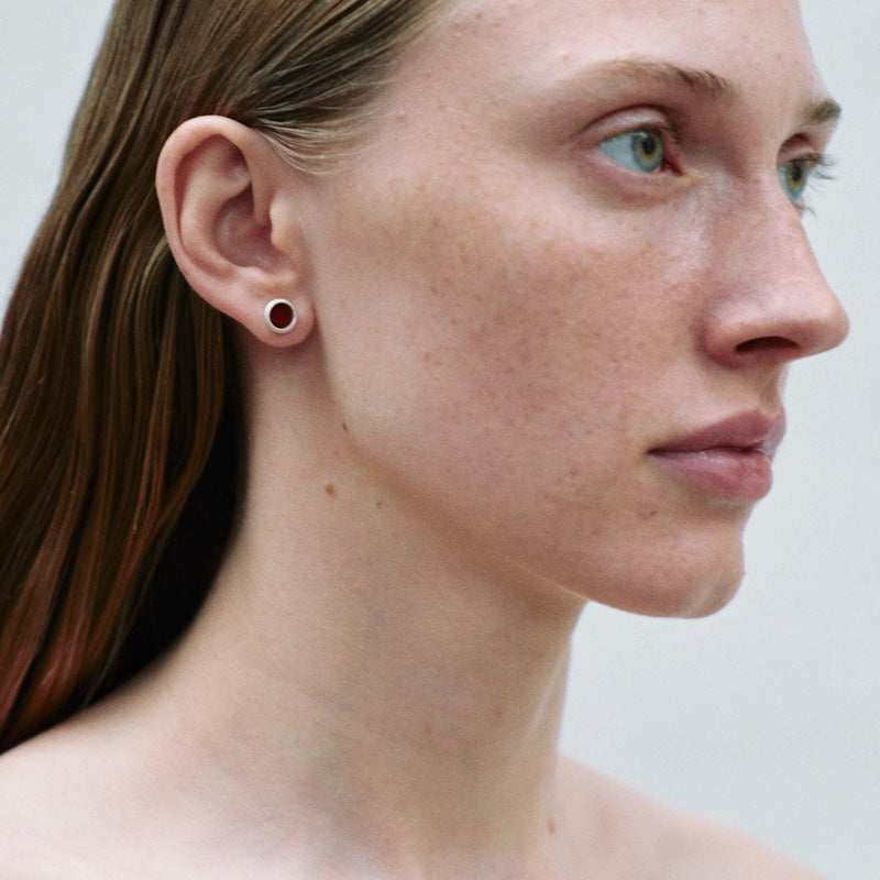 Matte White Silver Round Earrings with Black&Red Agate stones.